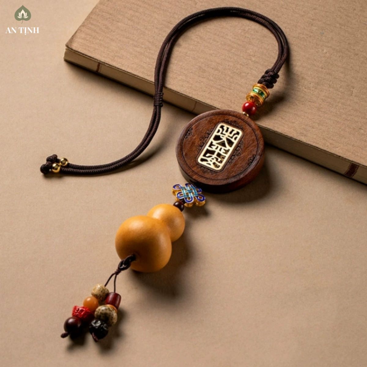 • Hồ Lô Tự Nhiên (Natural Gourd): Điểm nhấn quan trọng nhất là chiếc hồ lô bầu bĩnh nằm ở giữa. Khác với các loại hồ lô gỗ tiện máy, đây là quả hồ lô thật được phơi khô và xử lý kỹ thuật để giữ độ bền cao nhất. Trong phong thủy, hồ lô tự nhiên có khả năng “thu hút” bệnh khí và năng lượng xấu cực mạnh, giúp bảo vệ sức khỏe người lái.