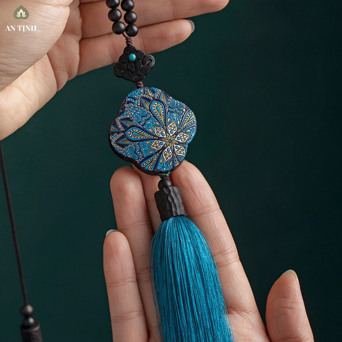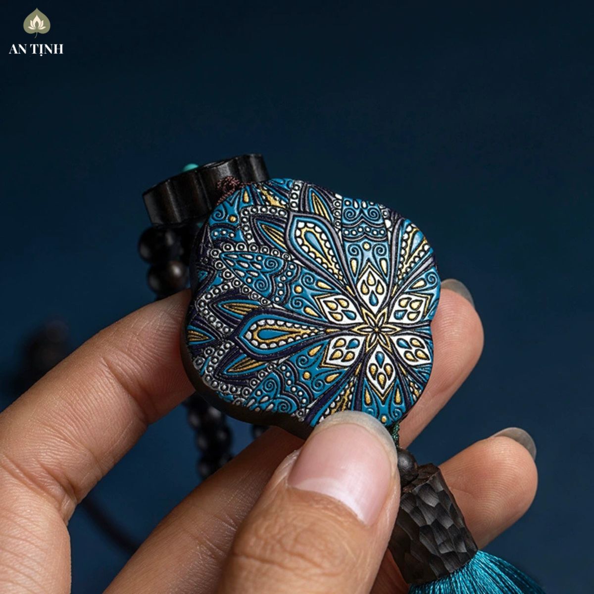 - Mặt Dây Cỏ Bốn Lá Vẽ Gấm: Điểm nhấn trung tâm là khối gỗ Hắc Đàn được tạo hình cỏ bốn lá – biểu tượng kinh điển của sự may mắn. Bề mặt được vẽ họa tiết hoa văn cổ điển màu xanh – vàng kim sắc nét, tạo cảm giác sang trọng và hoài cổ.
