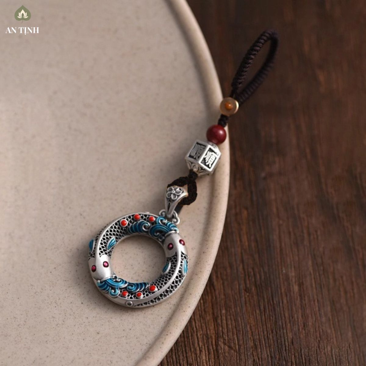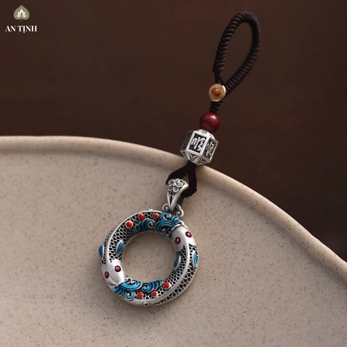 Móc Khóa Cá Koi Song Ngư là một phụ kiện phong thủy tinh xảo, được chế tác từ kim loại cao cấp với hoa văn chạm khắc tỉ mỉ, kết hợp màu men xanh – đỏ nổi bật. Thiết kế vòng tròn tượng trưng cho sự viên mãn, ở giữa là hình ảnh đôi cá Koi Song Ngư uốn lượn, biểu trưng cho sự cân bằng, sung túc và may mắn.