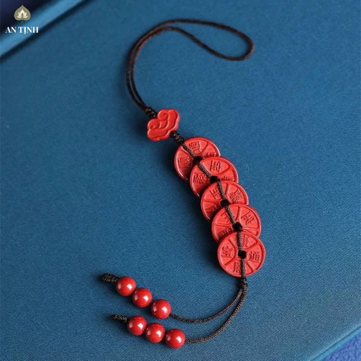 - Thiết kế 5 đồng tiền: Điểm nhấn chính của sản phẩm là chuỗi 5 viên chu sa được tạo hình như những đồng tiền cổ, xếp nối tiếp nhau dọc theo chiều dài dây.