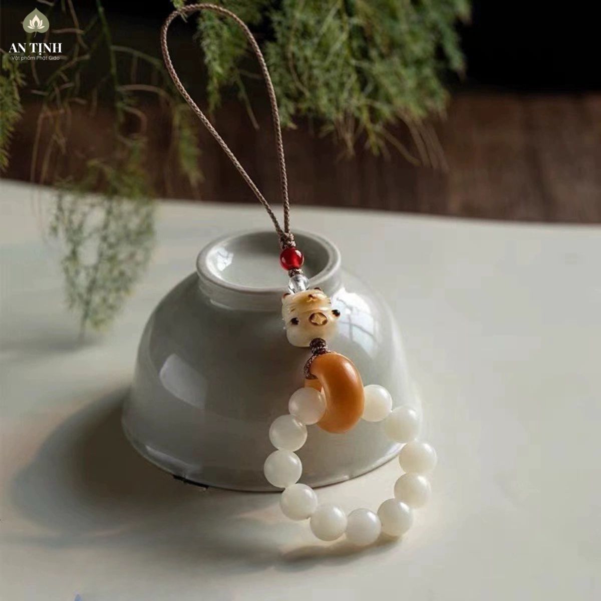 Dây móc được đính kèm các hạt bồ đề, loại hạt có ý nghĩa thanh tịnh trong đạo Phật, giúp người sử dụng luôn giữ được tâm an, trí sáng. Sản phẩm không chỉ là một phụ kiện trang trí tinh tế mà còn là món quà phong thủy mang theo năng lượng tích cực mỗi ngày.