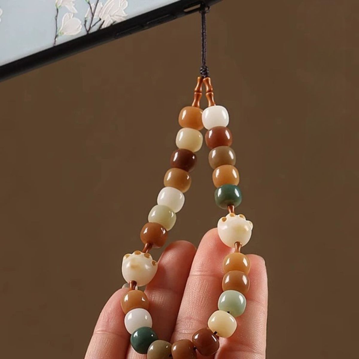 Phần dây được làm từ các hạt bồ đề – loại hạt linh thiêng thường xuất hiện trong các vật phẩm tâm linh, mang ý nghĩa thanh tịnh, an lành. Sản phẩm không chỉ là phụ kiện trang trí cho điện thoại mà còn là biểu tượng nhỏ của niềm tin, tâm linh và sự bảo hộ mỗi ngày.
