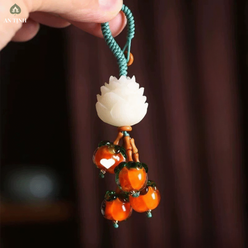 Móc Khóa Hoa Sen Cùng Quả Hồng là vật phẩm nhỏ gọn nhưng mang nhiều ý nghĩa phong thủy sâu sắc. Hoa sen biểu tượng cho sự thanh tịnh, giác ngộ và lòng từ bi, trong khi quả hồng tượng trưng cho sự viên mãn, hạnh phúc và bình an trong cuộc sống.