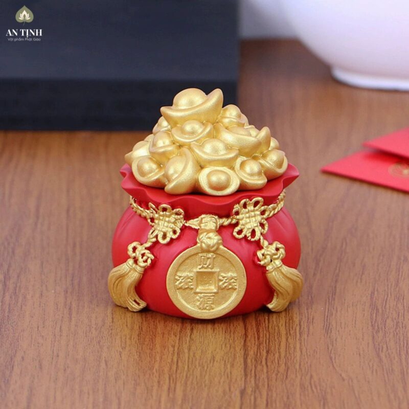 Túi đỏ chứa vàng tượng trưng cho tài lộc dồi dào, thăng tiến trong công việc và sự sung túc về tài chính. Trưng bày vật phẩm này giúp kích hoạt cung Tài Lộc, mang lại may mắn đặc biệt cho những người kinh doanh, buôn bán hoặc đang mong muốn thu hút vận may tài chính.