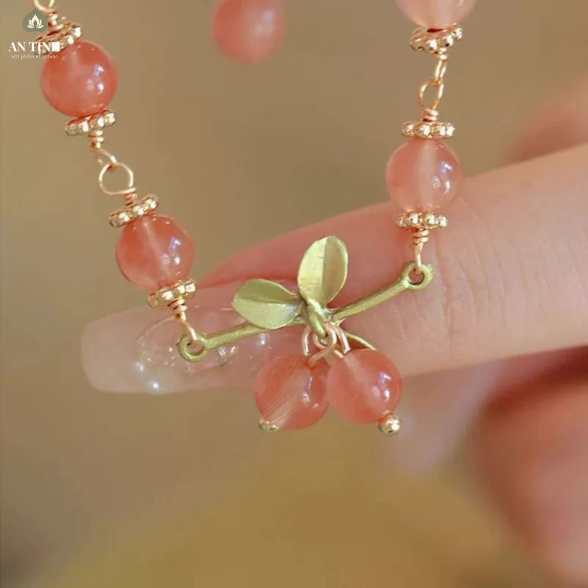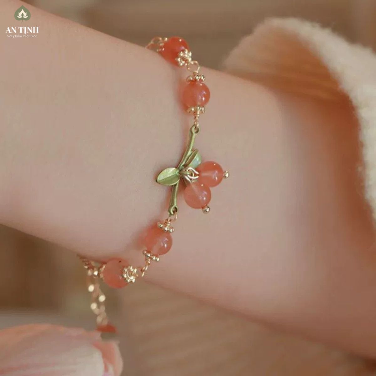 Trong quan niệm tâm linh, quả anh đào thể hiện sự mong manh nhưng kiên cường, gợi nhắc chúng ta biết trân trọng hiện tại và sống chánh niệm trong từng khoảnh khắc. Khi kết hợp trong chiếc vòng tay, đó là lời nhắc nhẹ nhàng về sự buông xả, tịnh tâm và yêu thương bản thân.