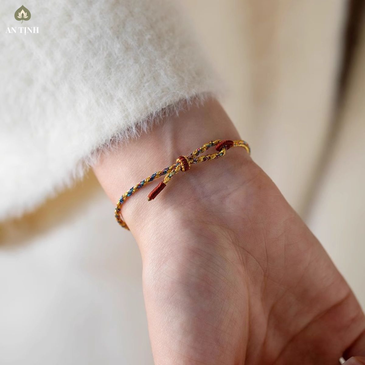 - Chỉ vàng lấp lánh: Sợi dây được tết tỉ mỉ từ những sợi chỉ mang sắc vàng kim chủ đạo, đan xen khéo léo cùng các đường chỉ màu (xanh, hồng) tinh tế. Thiết kế này tạo hiệu ứng màu sắc hài hòa, bắt sáng nhẹ nhàng và làm nổi bật làn da vùng cổ tay.