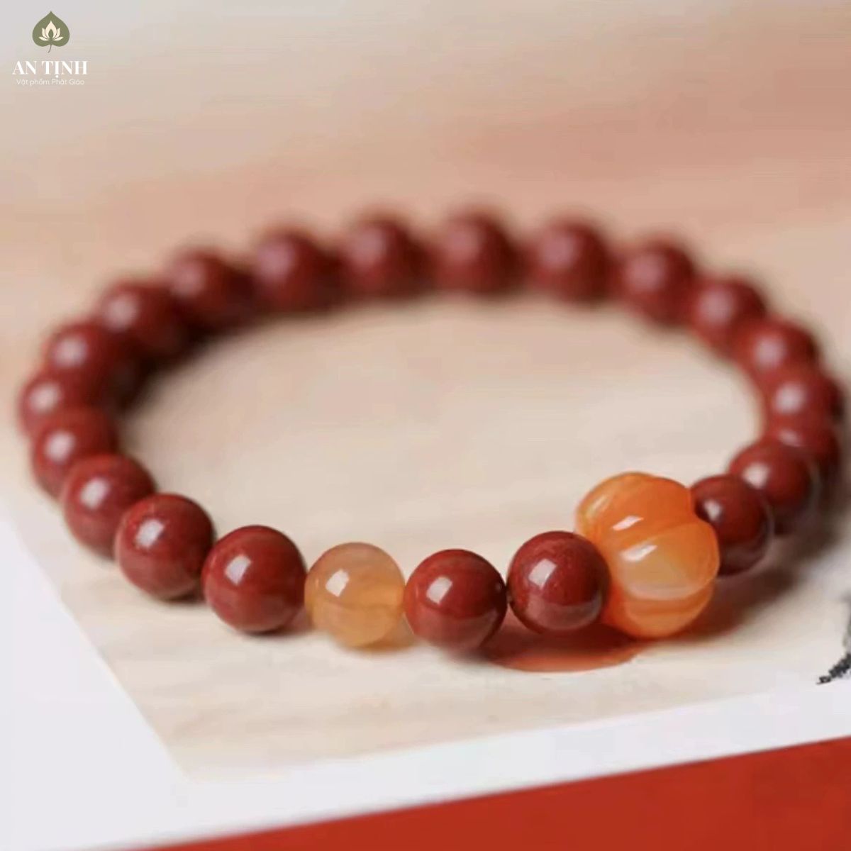 Điểm nhấn nổi bật của vòng là hạt đá hình quả bí ngô được chạm khắc tỉ mỉ từ đá mã não cam, biểu trưng cho sự sung túc, đầy đủ và vượng khí. Kết hợp cùng một hạt ngọc cam bán trong nhẹ nhàng tạo nên tổng thể hài hòa, vừa thu hút ánh nhìn vừa mang ý nghĩa phong thủy sâu sắc.