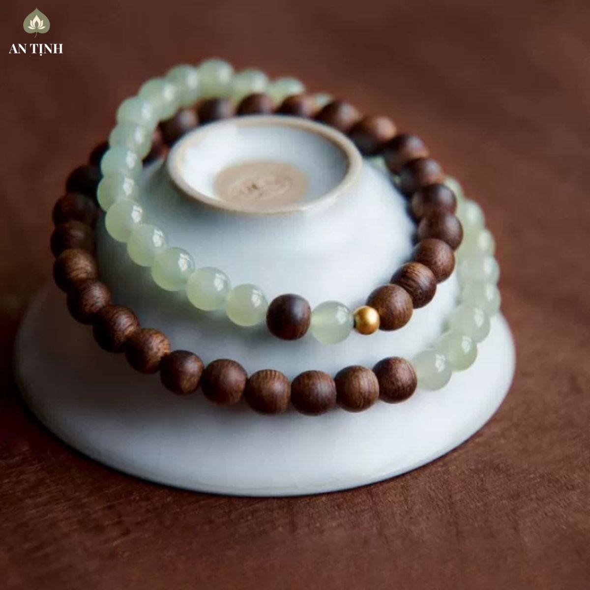 - Phần “Nước” (Ngọc Bích): Chuỗi hạt Ngọc Bích màu xanh lục nhạt, trong trẻo và mát lành. Nó đại diện cho Nước – tượng trưng cho sự mềm mại, linh hoạt (nhu) và khả năng chữa lành tâm hồn.